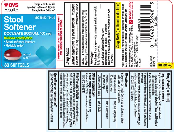 The following image provide visual information about the product associated with Stool Softener Laxative NDC 69842-794 by Cvs Pharmacy, such as packaging, labeling, and the appearance of the drug itself. This resource could be helpful for medical professionals, pharmacists, and patients seeking to verify medication information and ensure they have the correct product.