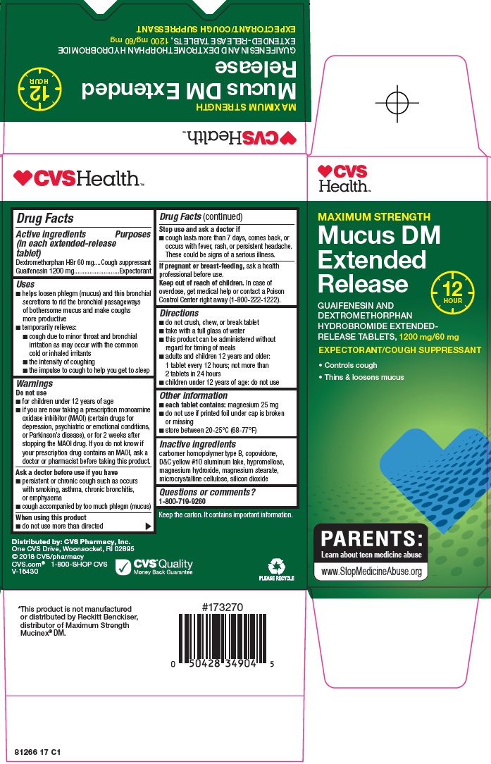 This is information regarding CVS pharmacy's Maximum Strength Mucus DM Extended Release tablets. The active ingredients are dextromethorphan hydrobromide and guaifenesin, which help suppress coughs and loosen mucus. The text provides specific directions for use and cautions for certain individuals, such as those under 12 or taking certain prescription drugs. Contact information is provided for questions or concerns.*