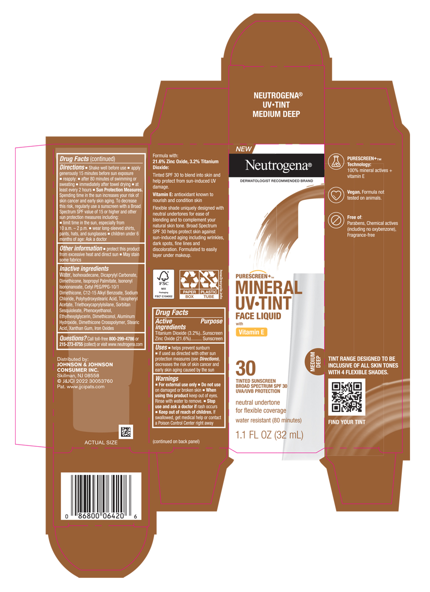 This is a drug facts label for Neutrogena UV-Tint face liquid sunscreen with SPF 30. It contains 21.6% zinc oxide and 3.2% titanium dioxide, and is tinted with neutral undertones to blend with natural skin tone. The sunscreen is water-resistant for 80 minutes and is formulated to protect against sun-induced skin aging and skin cancer. The product is free of parabens, fragrances, and chemical actives, and has not been tested on animals. The inactive ingredients include water, isohexadecane, and tocopheryl acetate, among others. The label provides directions for use, sun protection measures, warnings, and other information.*