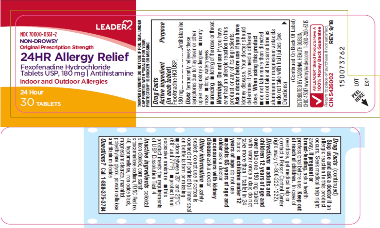 The following 2 images provide visual information about the product associated with 24hr Allergy Relief NDC 70000-0361 by Leader/ Cardinal Health 110, Inc., such as packaging, labeling, and the appearance of the drug itself. This resource could be helpful for medical professionals, pharmacists, and patients seeking to verify medication information and ensure they have the correct product.