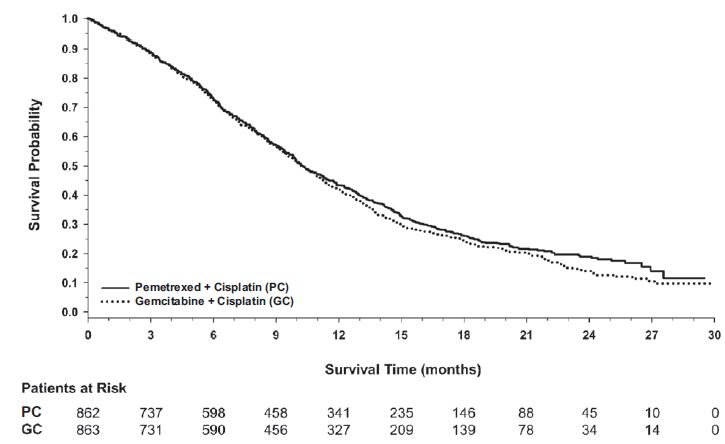 Survival Probability graph shows the comparison of the efficacy of Pemetrexed to Placebo in terms of survival time (months) for patients. The graph shows that Pemetrexed has better survival rates than Placebo. The number of patients at risk is also shown on the graph.*