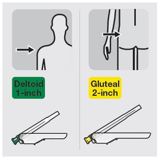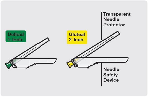 This is a description of a transparent 2-inch needle safety device designed for protecting the needle when not in use. The device is specifically mentioned for gluteal use.*