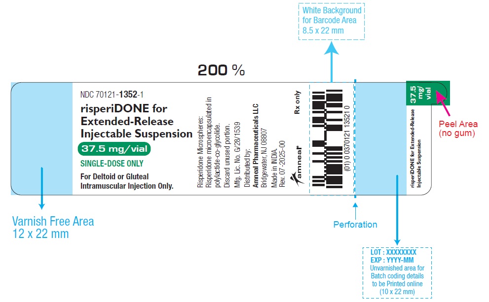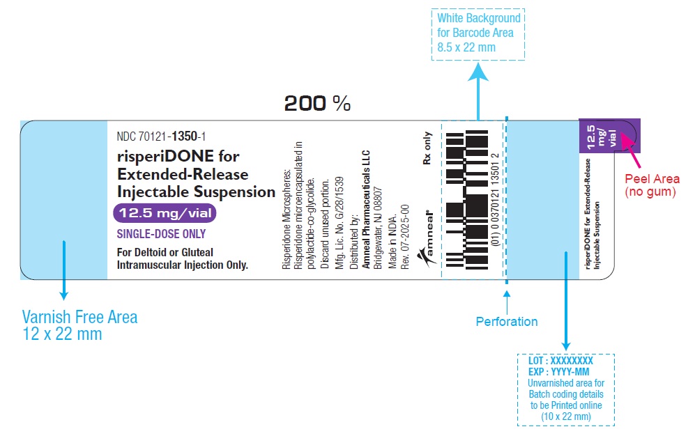 This text provides information about a medication identified by its NDC code (70121-1351-1) called risperidone for Extended-Release Injectable Suspension. It comes in single-dose vials with a concentration of 25 mg/vial and is meant for intramuscular injections in the deltoid or gluteal area. The prescription medication is for use in a specific way and requires a specific administration technique. The text includes markings for a Varnish Free Area and specific Peel Area instructions, along with codes related to the medicine. Additionally, there are symbols and characters throughout the text indicating essential instructions for use.*