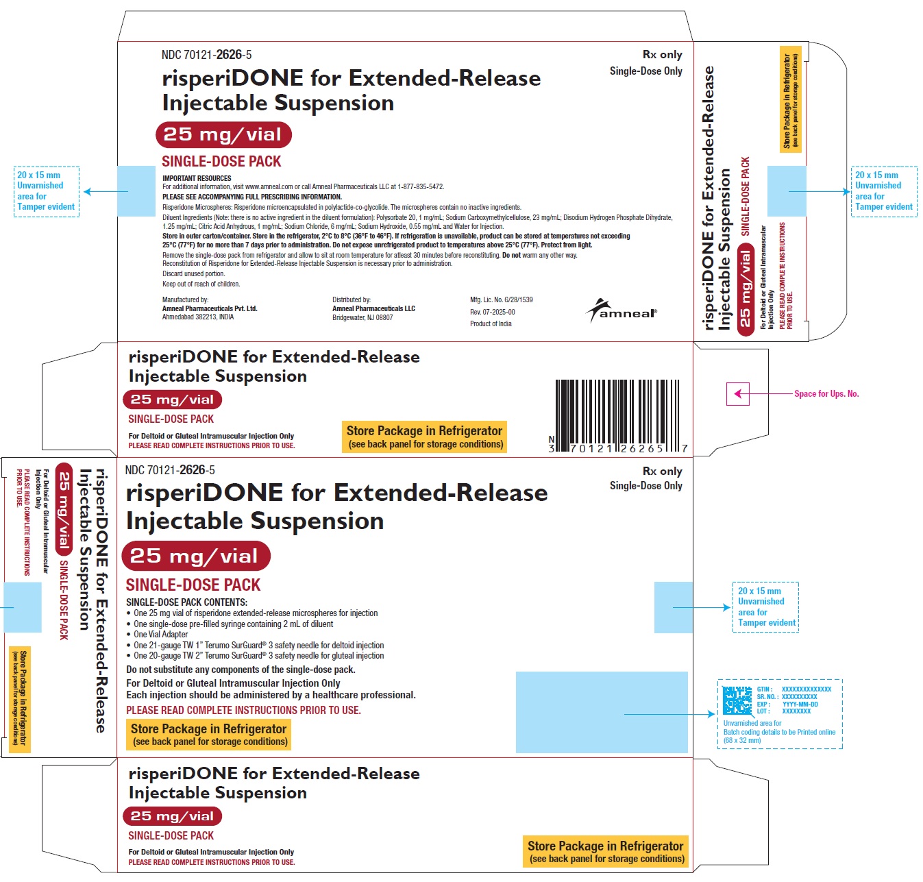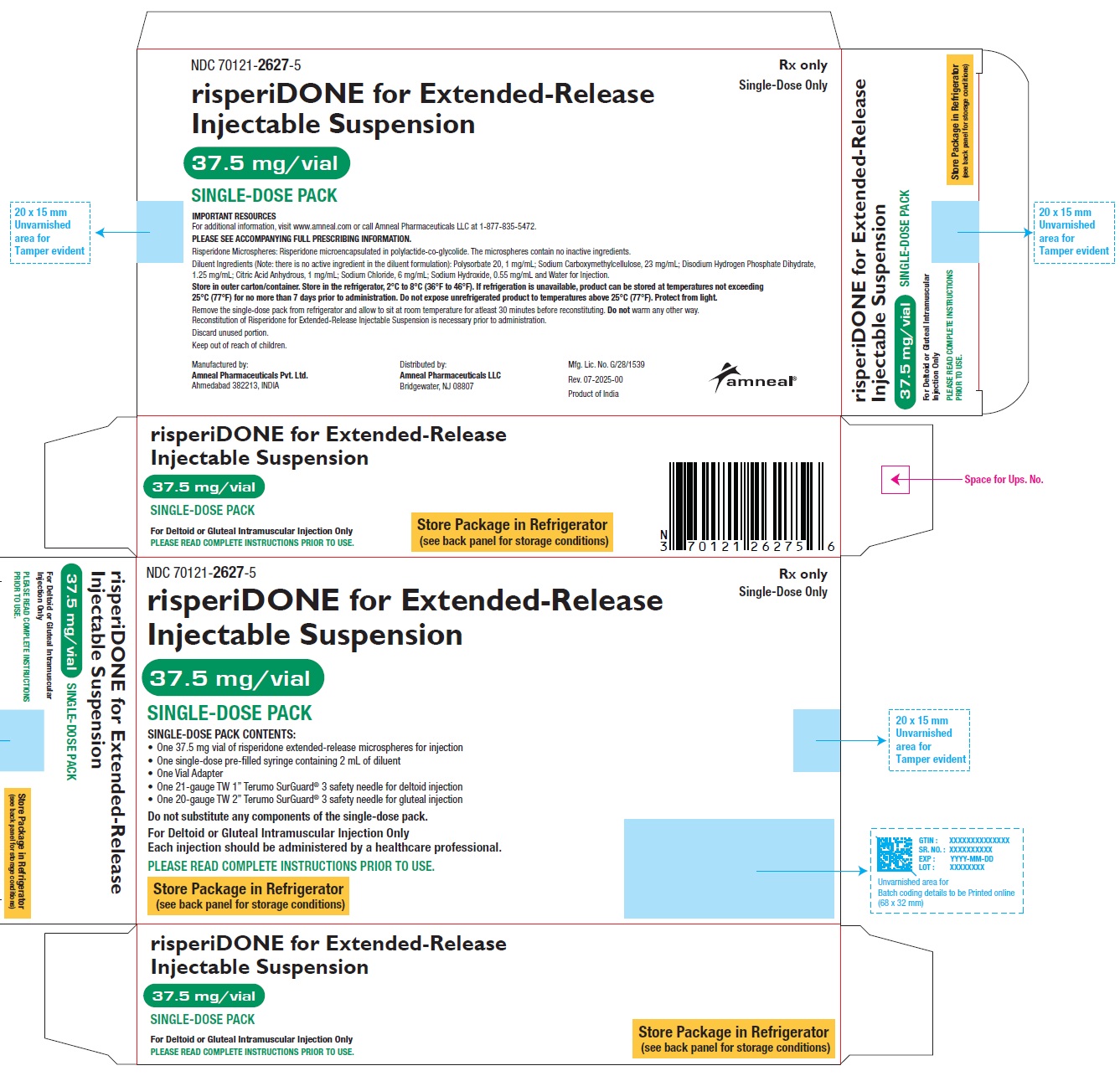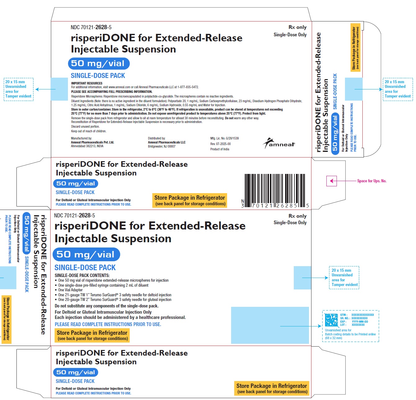 This text contains information about an injectable suspension medication that is for single-dose use only. It includes details such as the lot number, expiration date, manufacturing license number, and instructions for intramuscular injection in either the deltoid or gluteal area. The medication is labeled as an extended-release formulation. The product is distributed by Amneal Pharmaceuticals LLC in Bridgewater, NJ and manufactured in India.*