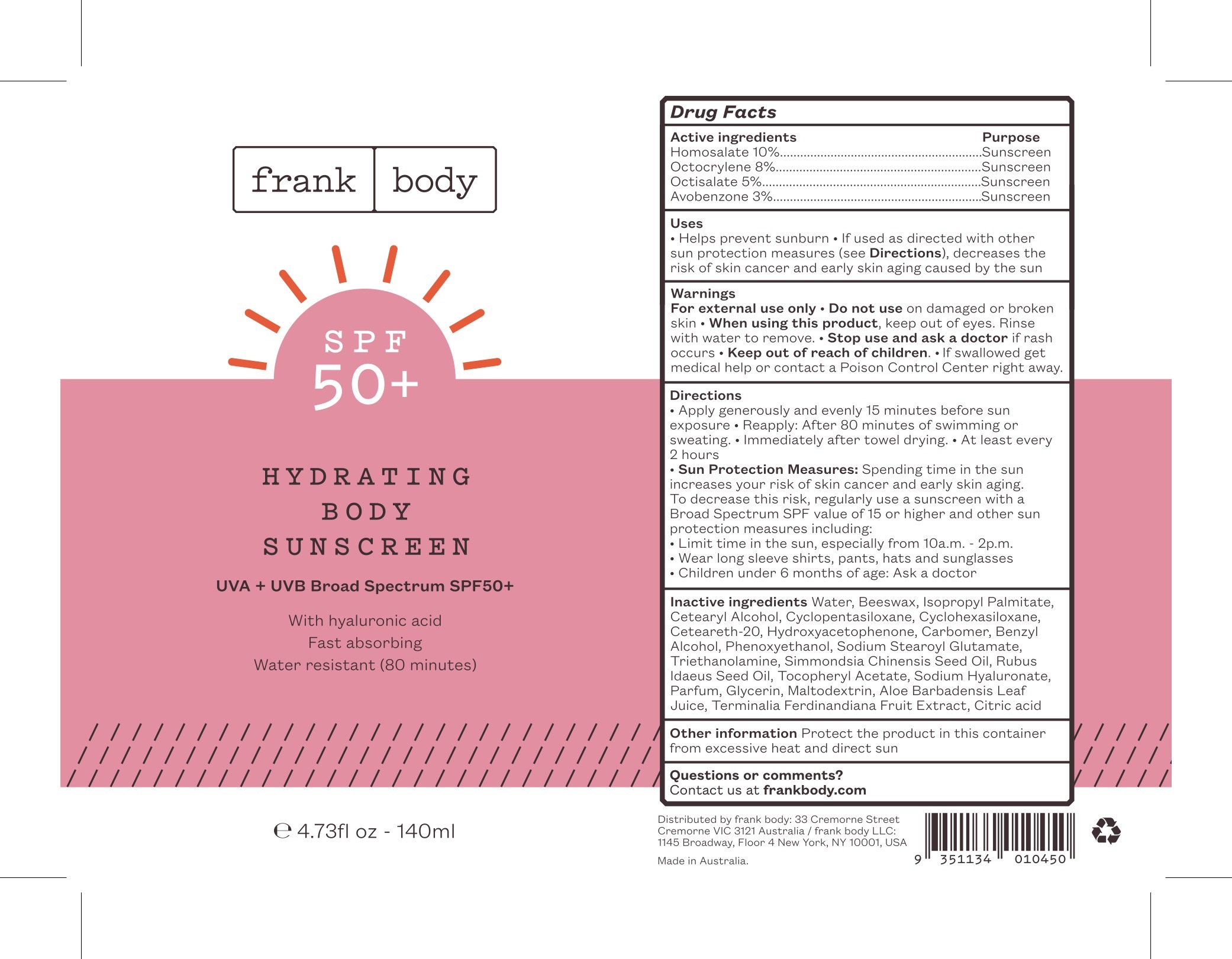 The following image provide visual information about the product associated with Hydrating Body Sunscreen Uva And Uvb Broad Spectrum Spf50 NDC 70157-009 by Baxter Laboratories Pty. Ltd., such as packaging, labeling, and the appearance of the drug itself. This resource could be helpful for medical professionals, pharmacists, and patients seeking to verify medication information and ensure they have the correct product.