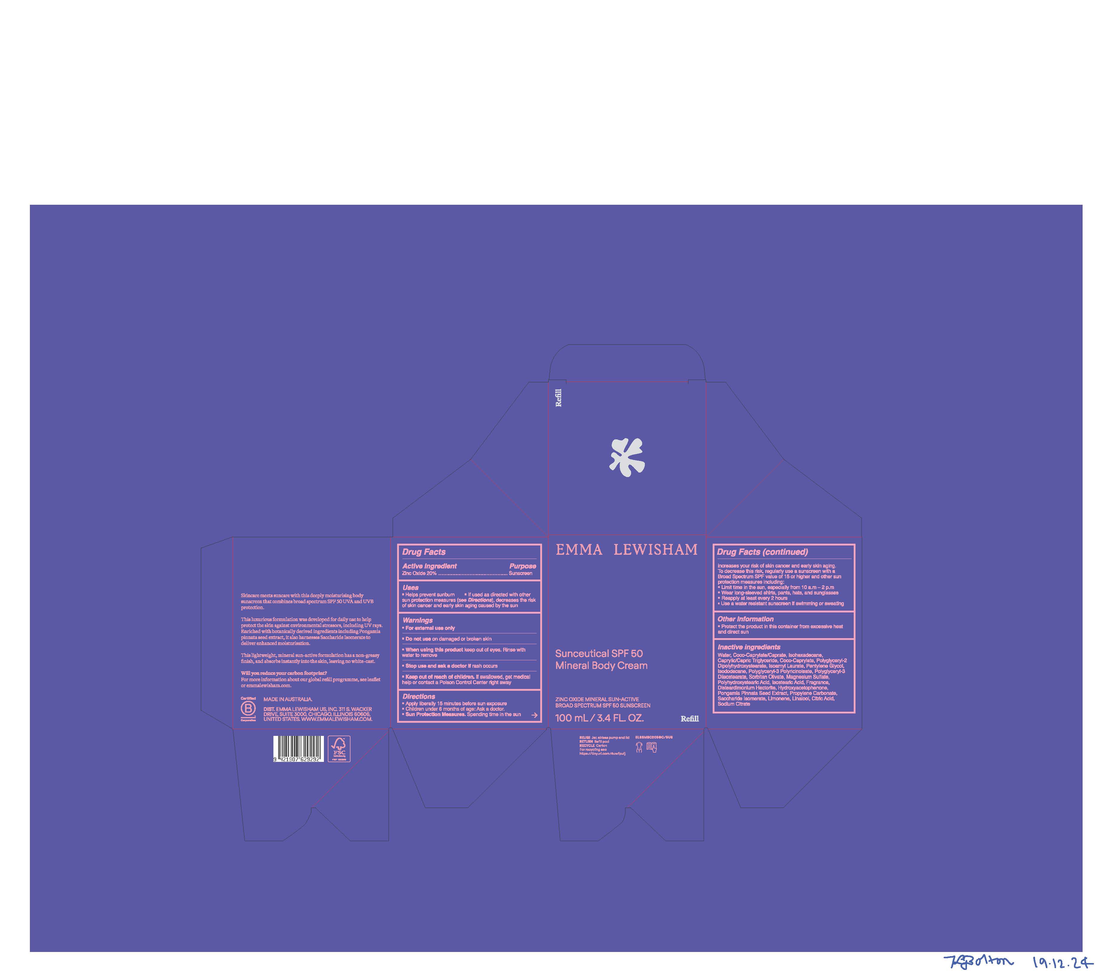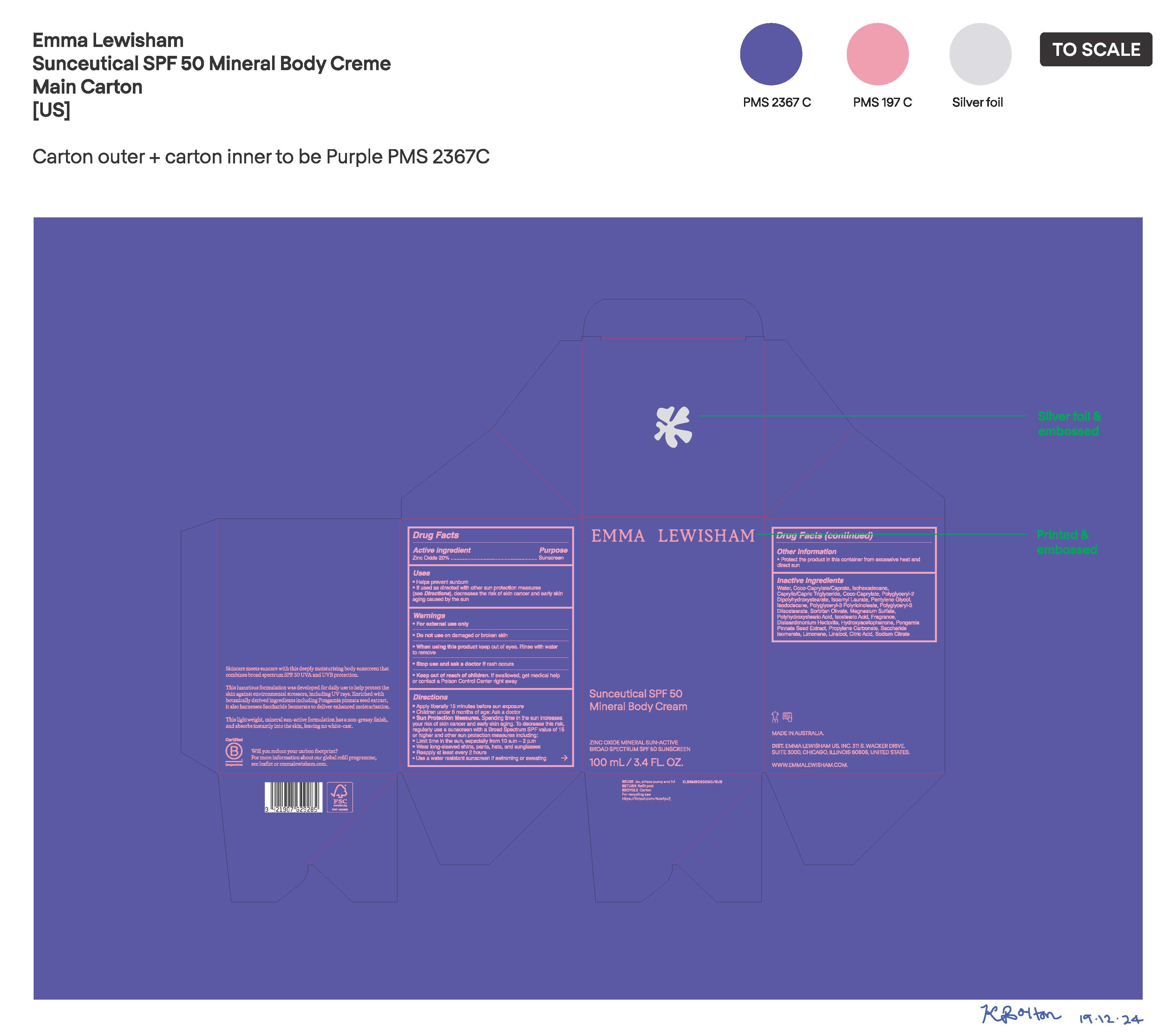 Emma Lewisham offers the Sunceutical SPF 50 Mineral Body Cream, a deeply moisturizing body sunscreen with broad-spectrum SPF 50 protection. This luxurious formulation is designed for daily use to shield the skin from environmental stressors, including UV rays. It contains botanically derived ingredients like Pongamia pinnata seed extract and Saccharide Isomerate for enhanced moisturization. The lightweight mineral sunscreen has a non-greasy finish, absorbs instantly, and does not leave a white cast. The product is made in Australia and distributed by Emma Lewisham US, Inc. in Chicago, Illinois. For more information, you can visit emmalewisham.com. To reduce your carbon footprint, they offer a global refill program. The product comes in packaging colored purple and is formulated with Zinc Oxide as the active ingredient for sun protection. It is important to follow the directions for application and reapplication as stated on the packaging to protect against sunburn, skin cancer, and early skin aging.*