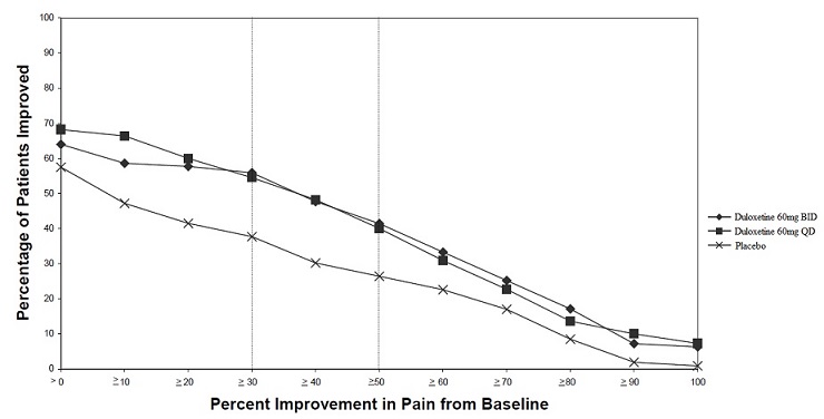 The text provides data related to the percentage of improvement in patients who took Duloxetine 60 mg daily compared to those who took a placebo. The graph also shows the percentage of pain improvement from a baseline.*