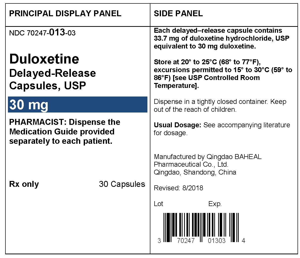 This is the label of Duloxetine Delayed-Release Capsules, USP containing 30 capsules with each capsule containing 67.3 myg of duloxetine hydrochloride and equivalent to 60 mg duloxetine. The medication guide should be dispensed separately to each patient. It is advisable to store the product at 20° to 25°C (68° to 77°F) and in a tightly closed container, out of reach of children. The dosage information can be found in the accompanying literature. The medication is manufactured by Qingdao BAHEAL Pharmacettical Co., Ltd. in China.*
