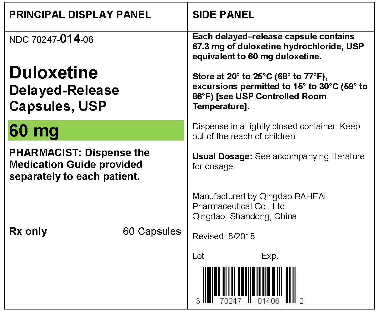 This is a description of Duloxetine Delayed-Release Capsules, USP, dosage 60mg. Each capsule contains 67.3mg of duloxetine hydrochloride, USP equivalent to 60mg duloxetine. The pharmacist has to dispense the Medication Guide separately to every patient. The capsules should be stored at 20° to 25°C (68° to 77°F), with excursions allowed to 15° to 30°C (59° to 86°F). The medication should be dispensed in a tightly closed container and kept out of reach of children. The usual dosage can be found in the accompanying literature. The medications are produced by Qingdao BAHEAL Pharmaceutical Co., Ltd. in Qingdao, Shandong, China. The lot number of the batch is "3 70247 01406 || 2". The text on the side panel is not available.*