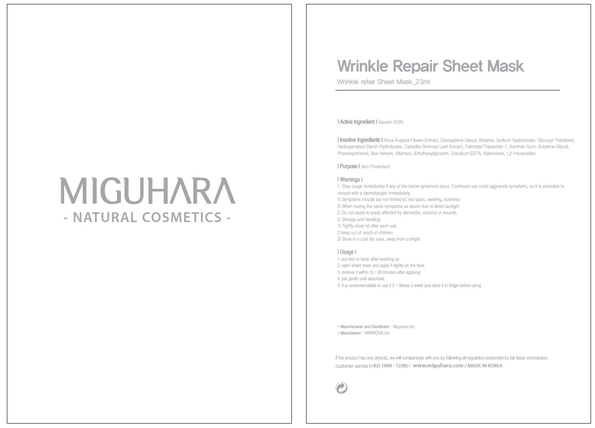 Miguhara is a brand of natural cosmetics that offers a Wrinkle Repair Sheet Mask with an active ingredient called Gycoin. There is a warning, but it is not provided in the text. The product is available for purchase at www.miguhara.com and marketed towards customers in Korea.*
