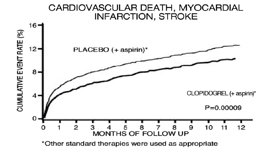 This appears to be a visual representation of a clinical trial comparing the effectiveness of clopidogrel and aspirin versus a placebo plus aspirin in preventing cardiovascular death, myocardial infarction, and stroke. The cumulative event rate is shown over the course of 12 months of follow-up. Standard therapies were also used as appropriate.*