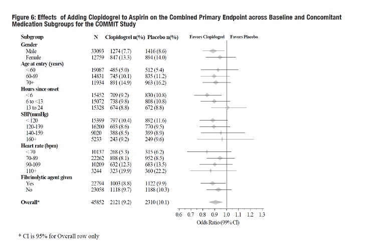 The text is describing the results of the COMMIT study, where patients received either placebo or clopidogrel, in addition to aspirin. It shows the cumulative event rates for death before discharge, with the placebo group having 8.1% deaths and the clopidogrel group having 7.5% deaths. The study found a 7% proportional risk reduction with clopidogrel, with p-value 0.03. The data is also presented in a figure with days since randomization on the x-axis and the percentage of dead patients on the y-axis.*