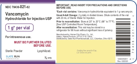 The following 3 images provide visual information about the product associated with Vancomycin Hydrochloride NDC 70436-021 by Slate Run Pharmaceuticals, Llc, such as packaging, labeling, and the appearance of the drug itself. This resource could be helpful for medical professionals, pharmacists, and patients seeking to verify medication information and ensure they have the correct product.