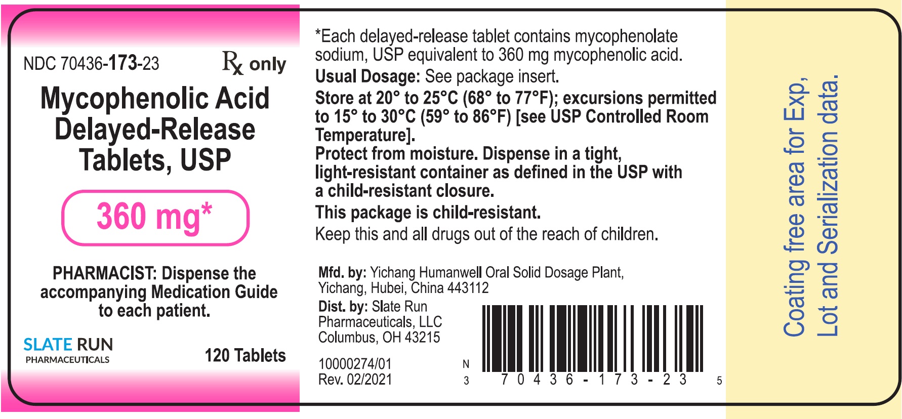 NDC 70436-173-23 is a medication used for delayed-release. It comes in the form of tablets containing Mycophenolic Acid, USP equivalent to 360 mg mycophenolic acid. It is advised for the pharmacist to dispense the accompanying medication guide to each patient. It also contains usual dosage guidance, and should be stored between 20 to 25°C. The medication should be protected from moisture and dispensed in a tight, light-resistant container. The package is child-resistant and should be kept out of the reach of children. The medicine is manufactured in China and distributed by Slate Run Pharmaceuticals in Columbus, OH. There is also a coating-free area for Expiration, Lot, and Serialization data.*