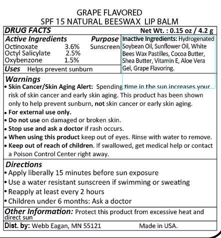 This is a Grape flavored, natural beeswax lip balm with SPF 15 sunscreen to help prevent sunburn. It contains active ingredients such as Octinoxate, Octyl Salicylate, and Oxybenzone. The lip balm also includes ingredients such as Soybean Oil, Cocoa butter, Shea Butter, and Vitamin E for skin moisture, and Aloe Vera Gel for a soothing effect. It comes with a warning that this product helps prevent sunburn only and not skin cancer or early skin aging. It should be applied 15 minutes before sun exposure and reapplied every 2 hours. Additionally, individuals with damaged or broken skin should avoid using the product, and in case of a rash occurring, medical help should be sought. It comes in a net weight of 0.1502/4.2 oz and is made in the USA.*