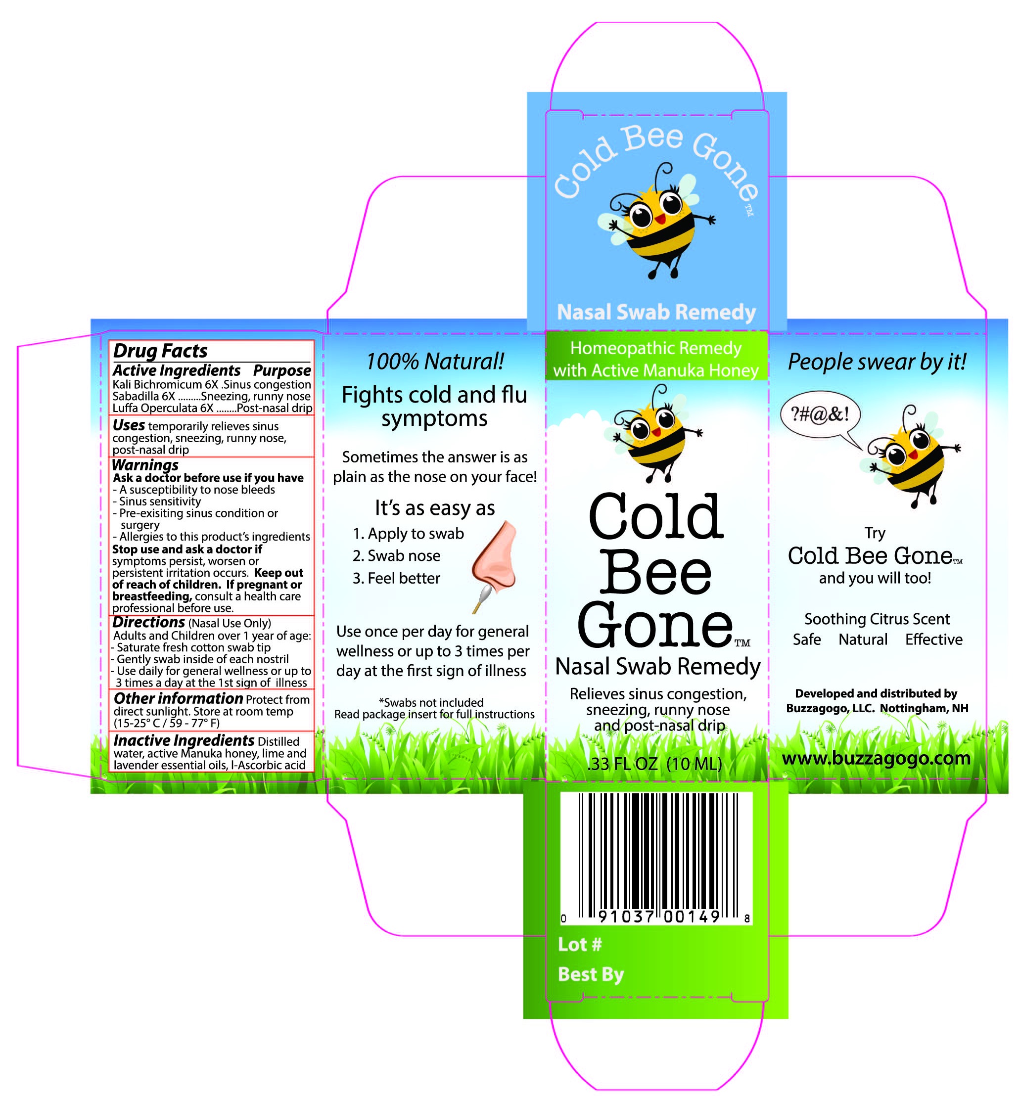 This is a drug facts label for a homeopathic remedy called Cold Bee Gone. Its active ingredients are Sabadilla 6X, which relieves sneezing and runny nose, and Luffa Operculata 6X, which relieves post-nasal drip. This remedy also contains Kali Bichromicum 6X to relieve sinus congestion. Cold Bee Gone can be used up to three times a day at the first sign of illness to relieve symptoms temporarily, but individuals who are pregnant or breastfeeding must first consult with a healthcare professional. This product also has a warning to consult with a doctor before use if there is a susceptibility to nose bleeds or allergies to the remedy's ingredients, sinus sensitivity, or a pre-existing sinus condition or surgery. The remedy should be kept out of reach of children and stored at room temperature. The inactive ingredients include distilled water, active Manuka honey, lime and lavender essential oils, and I-Ascorbic acid. The remedy requires a cotton swab which is not included, and the package insert should be read for full instructions. Developed and distributed by Buzzagogo, LLC in Nottingham, NH, Cold Bee Gone has a soothing citrus scent, is safe, and is natural and effective.*