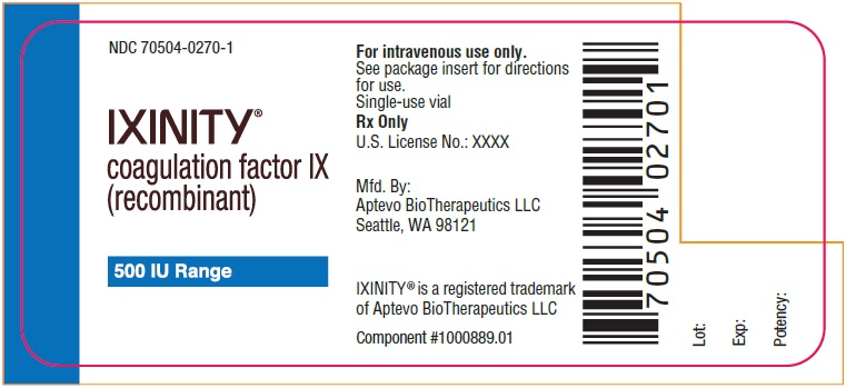 NDC 70504-0270-1 is a prescription medication called IXINITY. It contains 500 IU Range coagulation factor X, recombinant and is designed for intravenous use only. It comes in a single-use vial and requires a prescription. The U.S. License number is not readable. It is manufactured by Aptevo BioTherapeutics LLC in Seattle, WA. IXINITY is a registered trademark of Aptevo BioTherapeutics LLC. The package insert should be consulted for directions on its use.*