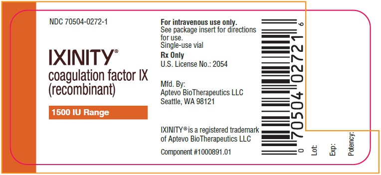 NDC 70504-0272-1 is a single-use vial of IXINITY, a recombinant coagulation factor IX used for intravenous use only. It has a range of 1500 1U and must be used under the directions in the package insert. It is manufactured by Aptevo BioTherapeutics LLC and has a US. License No.: 2054.*