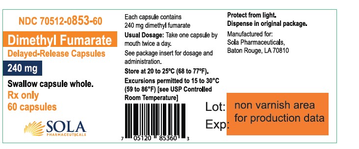 NDC 70512-0852-14 is a medication in the form of delayed-release capsules containing 120mg dimethyl fumarate per capsule. The recommended dosage is one capsule taken orally twice a day. These capsules should be swallowed whole and stored at controlled room temperature, between 20 to 25°C, with excursions permitted to 15 to 30°C. Protect from light and dispense in the original package. This medication is prescription only and comes in a package of 14 capsules. Manufactured for Sola Pharmaceuticals in Baton Rouge, LA.*