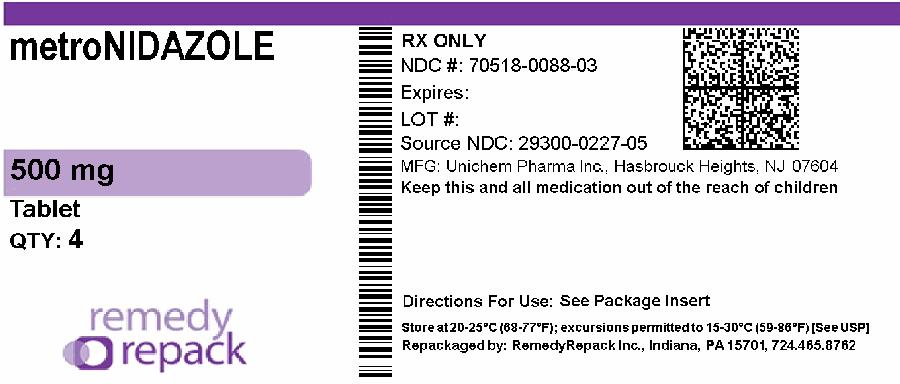 metroNIDAZOLE is a medication that comes in a tablet form with a strength of 500 mg, and it is only available with a prescription (RX ONLY). It has an NDC number of 70518-0088-05, and its source NDC is 29300-0227-05. The manufacturer of the medication is Unicher Pharma Inc., and it should be kept out of the reach of children. The medication should be stored between 20-25°C (68-77°F) with excursions permitted between 15-10°C (59-86°F) as per USP. The medication has been repackaged by RemedyRepack Inc., Indiana, PA 15701, and the package insert provides directions for use.*