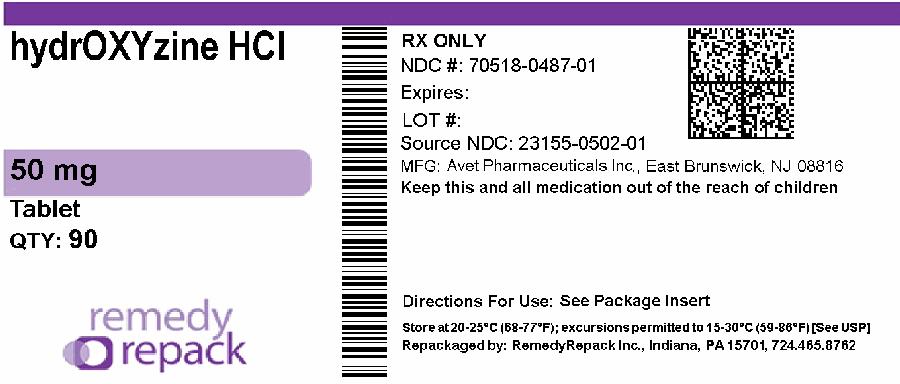 Hydroxyzine HCl is a tablet containing 50mg of medication. This is a prescription drug that comes in a 90-count bottle. The drug is packaged by RemedyRepack Inc., located in Indiana, PA. The manufacturer, Avet Pharmaceuticals Inc., is based in East Brunswick, NJ. The NDC number is 70518-0487-01, and the source NDC is 23155-0502-01. The package insert should be consulted for usage instructions. The medication should be stored at 20-25°C (58-77°F), with excursions allowed to 15-30°C (59-86°F), as per USP standards. The lot number and expiration date are not available. This medication and all others should be kept out of the reach of children.*