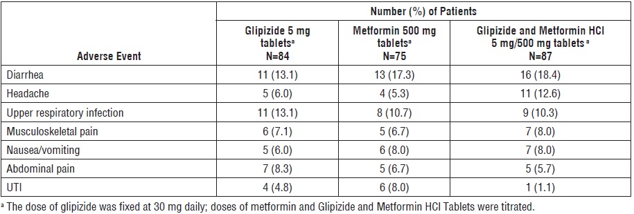 This appears to be a table showing the number of patients and the percentage of patients experiencing adverse events while taking Glipizide 5 mg, Metformin 500 mg, and Glipizide and Metformin HCI tablets. The adverse events listed include diarrhea, headache, upper respiratory infection, musculoskeletal pain, nausea/vomiting, abdominal pain, and UTI. The dose of Glipizide was fixed at 30 mg daily, while the doses of Metformin and Glipizide and Metformin HCI Tablets were titrated.*