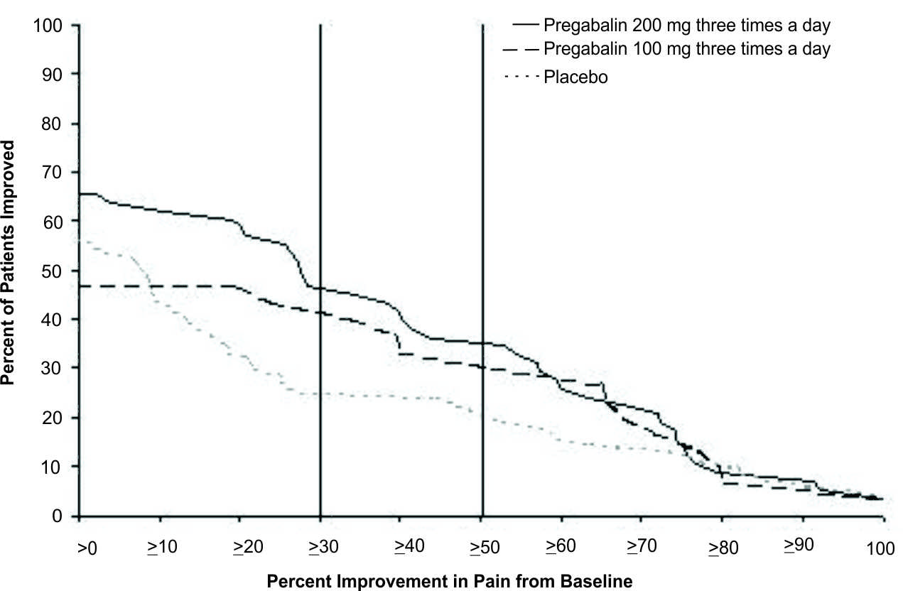 This is a graph showing the percentage of patients who improved after taking Pregabalin 100 mg three times a day compared to a placebo. The improvement in pain from baseline is also displayed in percentages ranging from 10 to 100.*