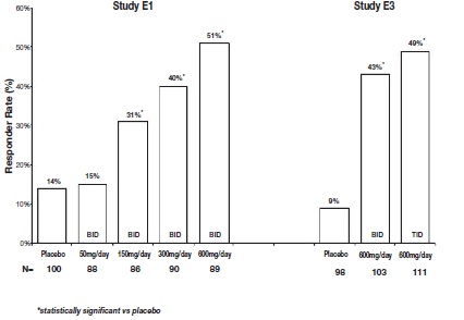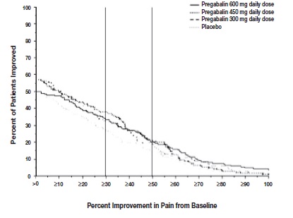 Study SCI 1: This 12-week, randomized, double-blind, parallel-group, multicenter, flexible dose (150 to 600 mg/day) study compared pregabalin with placebo. The 12-week study consisted of a 3-week dose adjustment phase and a 9-week dose maintenance phase. Treatment with pregabalin 150 to 600 mg/day statistically significantly improved the endpoint weekly mean pain score, and increased the proportion of patients with at least a 30% and 50% reduction in pain score from baseline. The fraction of patients achieving various levels of improvement in pain intensity from baseline to Week 12 is presented in Figure 11. Some patients experienced a decrease in pain as early as week 1, which persisted throughout the study.