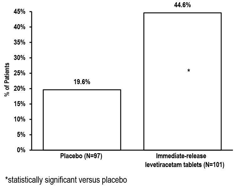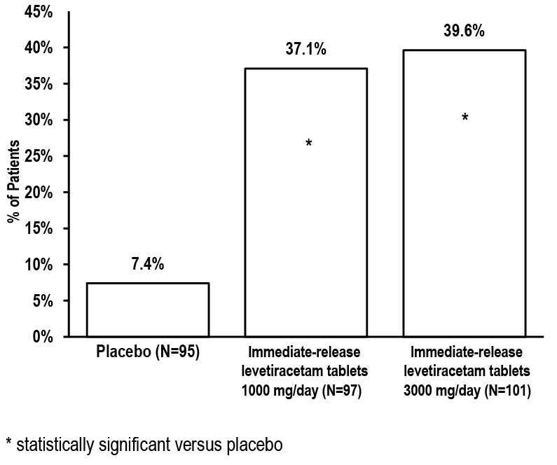 This is a description of the percentage of patients in a study who were assigned to different treatment groups. The first treatment group received placebo (N=111), the second group received immediate-release levetiracetam tablets at a dosage of 1000 mg/day (N=106), and the third group received immediate-release levetiracetam tablets at a dosage of 2000 mg/day (N=105). The text also indicates that the results for one of the treatment groups were statistically significant compared to the placebo group.*