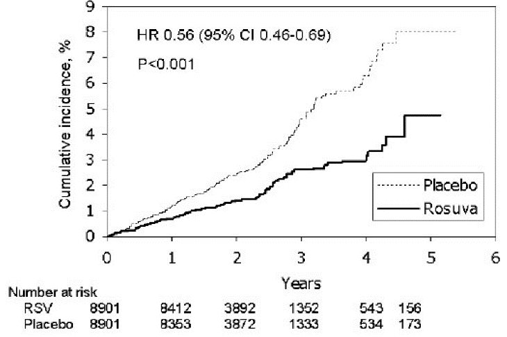This is a statistical analysis of the efficacy of Rosuvastatin 20 mg compared to Placebo 20 mg in a study with 8901 participants. The data includes various endpoints such as cardiovascular death, nonfatal stroke, nonfatal myocardial infarction (MI), unstable angina, and arterial revascularization. The results show significant reductions in the primary endpoint (Major Cardiovascular Events), nonfatal stroke, nonfatal MI, unstable angina, and arterial revascularization when treated with Rosuvastatin compared to Placebo. The analysis indicates that Rosuvastatin may be effective in reducing cardiovascular risk.*