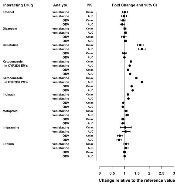This is a list of drug-drug interactions showing the fold change and 90% confidence interval for various drug analytes when interacting with venlafaxine and other medications such as ethanol, diazepam, cimetidine, ketoconazole, indinavir, metoprolol, imipramine, and lithium. The text also includes information on interactions based on different CYP2D6 phenotypes. The data seems to compare the maximum concentration (Cmax) and area under the curve (AUC) for these drug combinations. This information can be useful in understanding how these medications may influence each other's pharmacokinetics.*