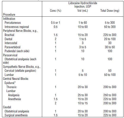 Table 1 (Recommended Dosages) summarizes the recommended volumes and concentrations of Lidocaine Hydrochloride Injection, USP for various types of anesthetic procedures. The dosages suggested in this table are for normal healthy adults.