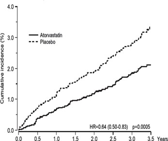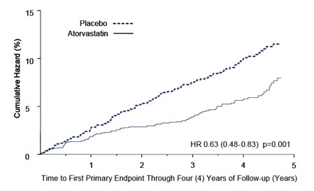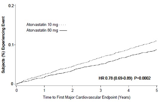 This text provides information on a study involving the use of Atorvastatin at different doses (10 mg and 80 mg). It includes data on the percentage of subjects experiencing events, hazard ratio (HR), and the time to the first major cardiovascular endpoint in years.*