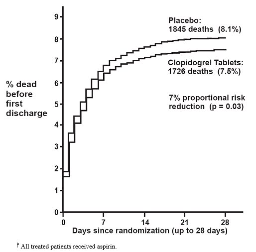 The text provided describes the comparison of mortality rates between a placebo group and a group receiving Clopidogrel tablets. The data shows 1845 deaths (8.1%) in the placebo group and 1726 deaths (7.5%) in the group receiving Clopidogrel tablets. There is a 7% proportional risk reduction associated with Clopidogrel tablets with a p-value of 0.03. The study was conducted over 28 days with all treated patients also receiving aspirin.*