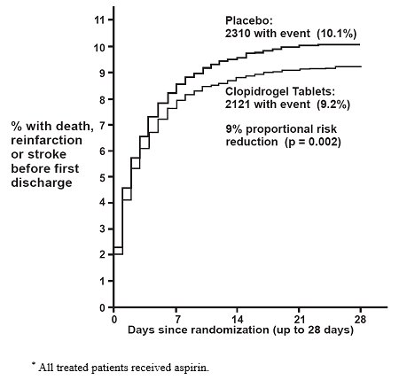 This description provides data on the comparison between a placebo and Clopidrogel Tablets in reducing the risk of death, reinfarction, or stroke before discharge. The study reveals a 9% proportional risk reduction with Clopidrogel Tablets compared to the placebo group, with statistical significance (p=0.002). The graph displays the progression of events over 28 days since randomization, with all treated patients also receiving aspirin.*
