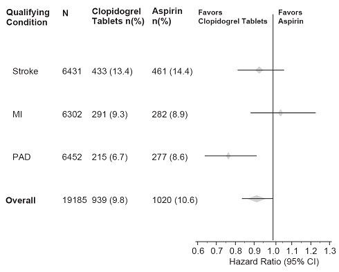 The provided text includes data on the number and percentage of patients taking Clopidogrel tablets and Aspirin in relation to stroke and PAD conditions. It also mentions hazard ratios with corresponding confidence intervals. The information seems to be part of a study or report evaluating the efficacy of these medications in specific conditions.*