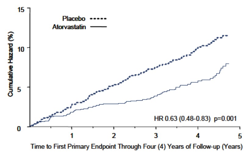 This description provides information about the effectiveness of Atorvastatin in reducing the risk of the primary endpoint over a four-year follow-up period. The hazard ratio is 0.63 with a confidence interval of 0.48-0.83 and a p-value of 0.001. The graph shows the time to the first primary endpoint.*