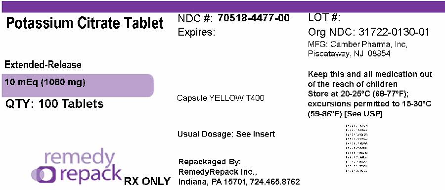 This text provides information about a Potassium Citrate Tablet in extended-release form containing 10 mEq {1080 mg}. The package contains 100 tablets with a yellow T400 capsule color. The NDC number for the product is 70518-4477-00, and it is manufactured by Camber Pharma, Inc. The medication should be stored at 20-25°C (68-77°F) with excursions permitted to 15-30°C (59-86°F). Additionally, the text includes contact information for RemedyRepack Inc. for repackaging and states to keep the medication out of reach of children.*