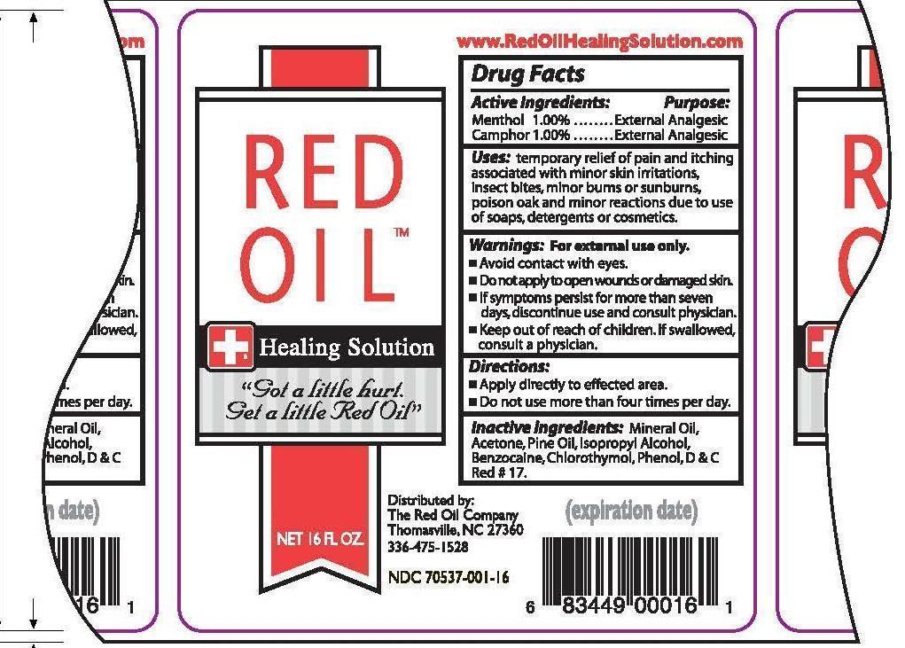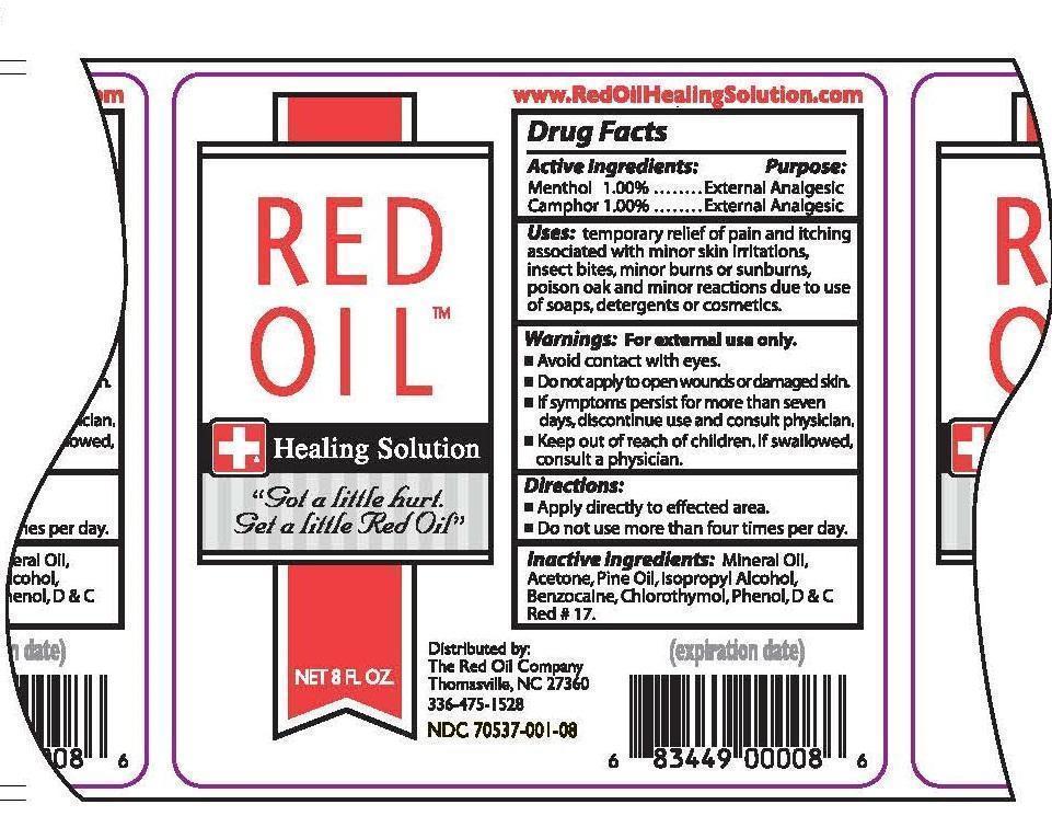 Healing Solution is a medication that provides temporary relief of pain and itching caused by minor skin irritations, insect bites, minor burns or sunburns, poison oak, and minor reactions due to the use of soaps, detergents or cosmetics. It contains Menthol (1.00%) as an active ingredient and should be applied directly to the affected area, not more than four times a day. The medication should not be applied to open wounds or damaged skin, contact with eyes should be avoided, and it should not be used continuously for more than seven days. It contains Mineral O, Acetone, Pine Oil, Isopropyl Alcohol, Benzocaine, Chlorothymol, Phenol, D & C Red #17 as inactive ingredients. The distributor is The Red Oil Com, and it is not recommended for internal use.*