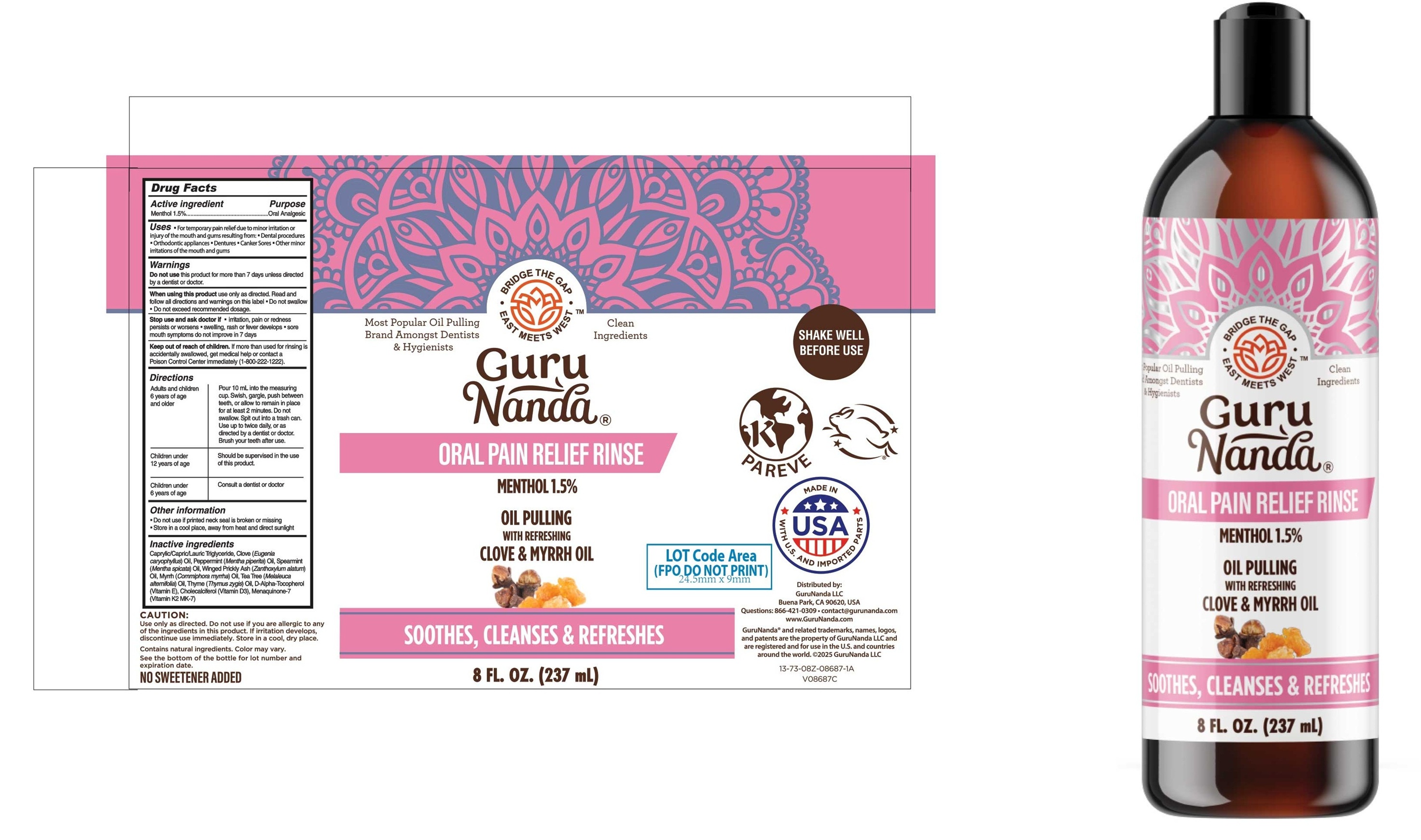 This product is an oral pain relief rinse containing menthol and other natural ingredients such as clove and myrrh oil. It is designed to provide temporary pain relief for various oral irritations such as dental procedures, orthodontic appliances, dentures, canker sores, and minor gum irritations. The rinse should be used as directed, not exceeding the recommended dosage. It is advised to consult a dentist or doctor if symptoms persist or worsen. The product should be kept out of reach of children and not swallowed. Additionally, it is important to note that the rinse should not be used for more than 7 days without direction from a medical professional.*