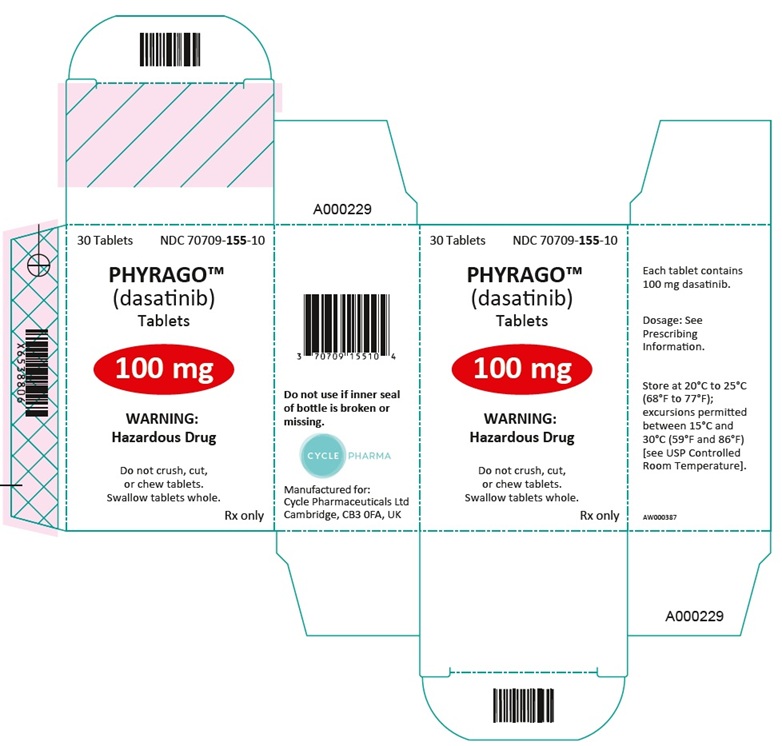 This text is a label for PHYRAGO tablets containing dasatinib, a hazardous drug that should not be crushed, cut, or chewed, but swallowed whole. Each tablet has 100 mg of dasatinib. It provides information on dosage, storage conditions (20°C to 25°C) and manufacturer details for Cycle Pharmaceuticals Ltd in the UK. The NDC number for the tablets is 70709-155-10.*