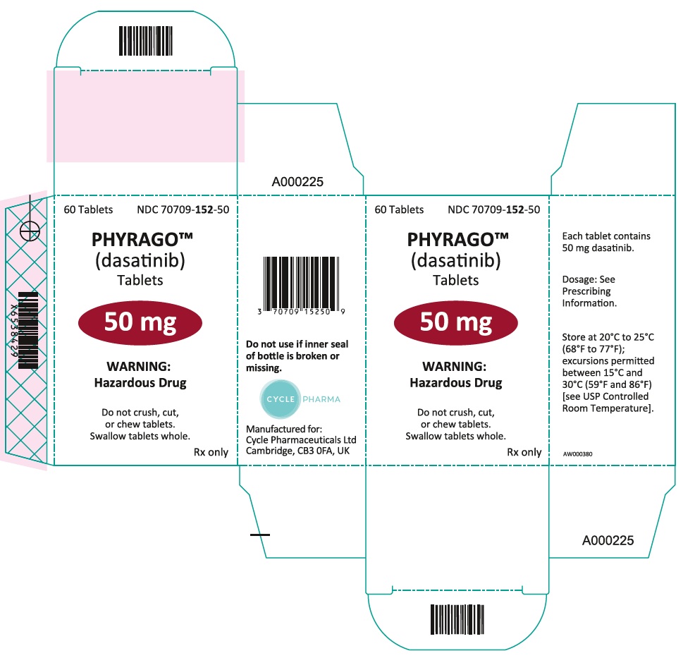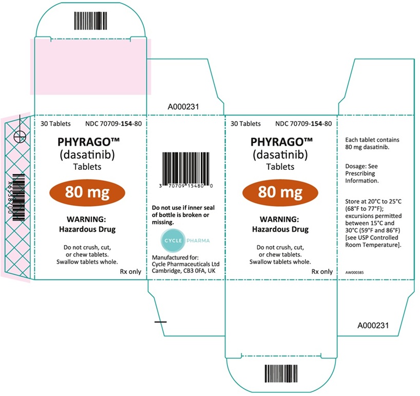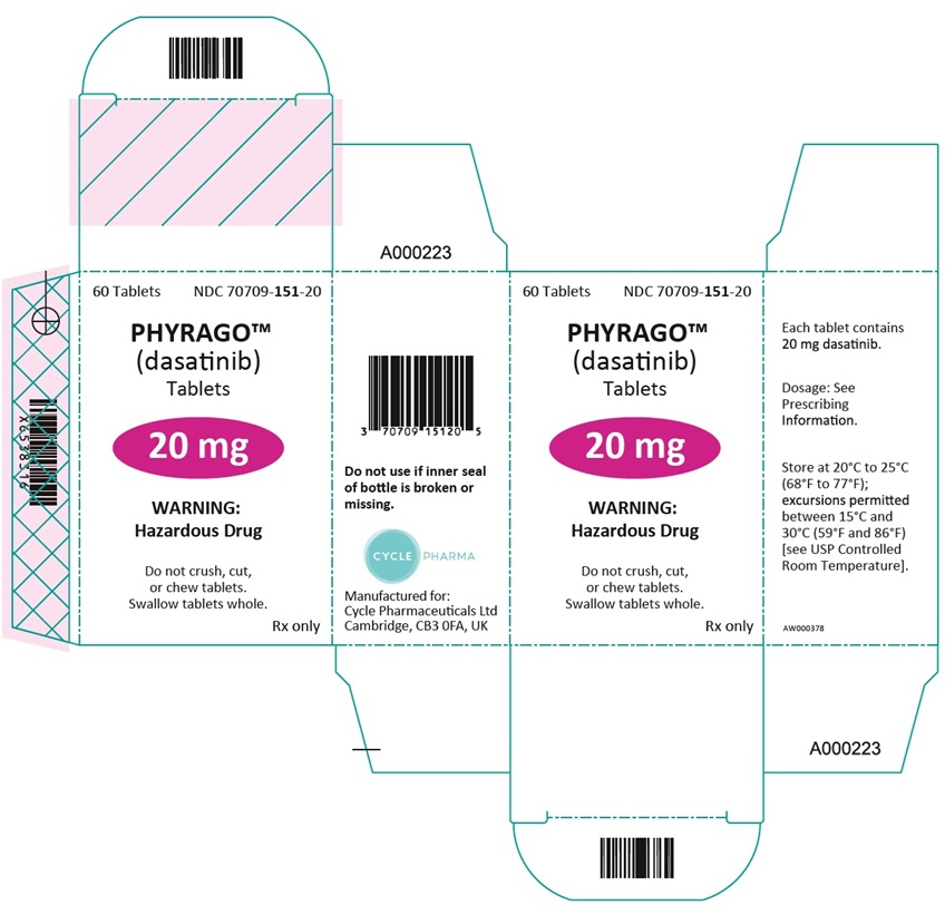 This is a description for PHYRAGO™ (dasatinib) Tablets. There are 60 tablets in each bottle with the NDC number 70709-153-70. The dosage information is available in the prescribing information. It is important not to use if the inner seal of the bottle is broken or missing. These tablets are classified as a Hazardous Drug. Instructions state not to crush or chew tablets; they should be swallowed whole. The manufacturer of PHYRAGO™ is Cyle Pharmaceuticals Ltd, located in Cambridge, UK.*