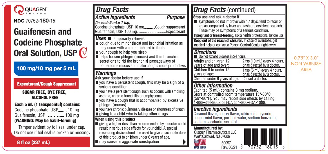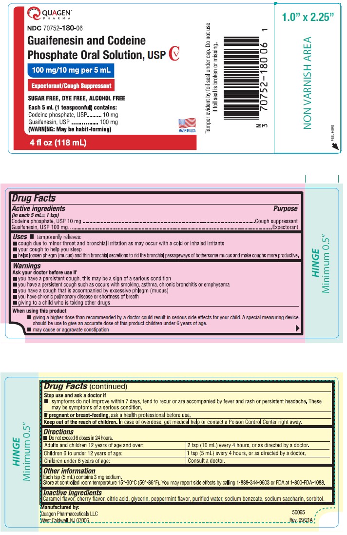The following 3 images provide visual information about the product associated with Guaifenesin And Codeine Phosphate NDC 70752-180 by Quagen Pharmaceuticals Llc, such as packaging, labeling, and the appearance of the drug itself. This resource could be helpful for medical professionals, pharmacists, and patients seeking to verify medication information and ensure they have the correct product.