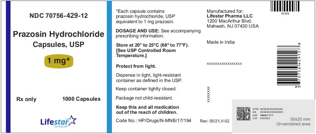 This is a bottle of Prazosin Hydrochloride capsules, USP containing 1000 capsules manufactured by Lifestar Pharma LLC. Each capsule contains prazosin hydrochloride, USP equivalent to 1 mg prazosin. It is used as prescribed medication and should be kept out of reach of children. The bottle must be stored at a controlled room temperature and protected from light. The manufacturer's prescribing information should be consulted for dosage and usage instructions. Made in India.*