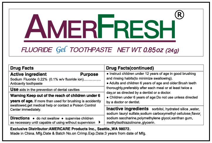This is a drug facts label for Amerfresh's fluoride gel toothpaste. The toothpaste contains sodium fluoride (0.22%) as an active ingredient which aids in preventing dental cavities. However, it is advised to keep it out of reach of children under 6 years of age and not to swallow it. The package contains 0.85 oz (24g) of toothpaste, and it is produced in China.*