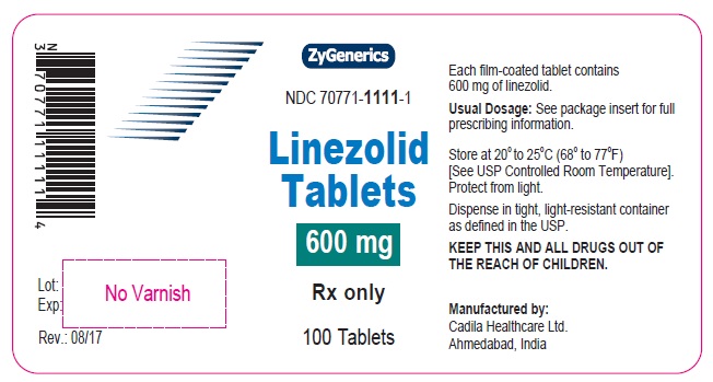 The following image provide visual information about the product associated with Linezolid NDC 70771-1111 by Zydus Lifesciences Limited, such as packaging, labeling, and the appearance of the drug itself. This resource could be helpful for medical professionals, pharmacists, and patients seeking to verify medication information and ensure they have the correct product.