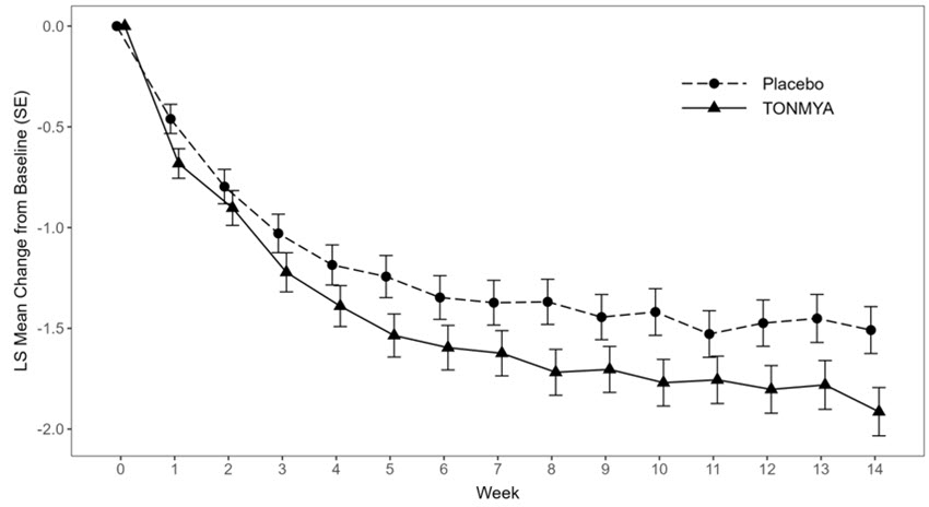 LS Mean Change from Baseline (SE) for Placebo and TONMYA. The values are not specified in the provided text.*