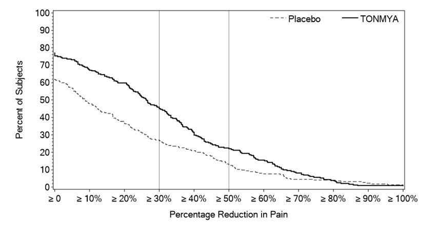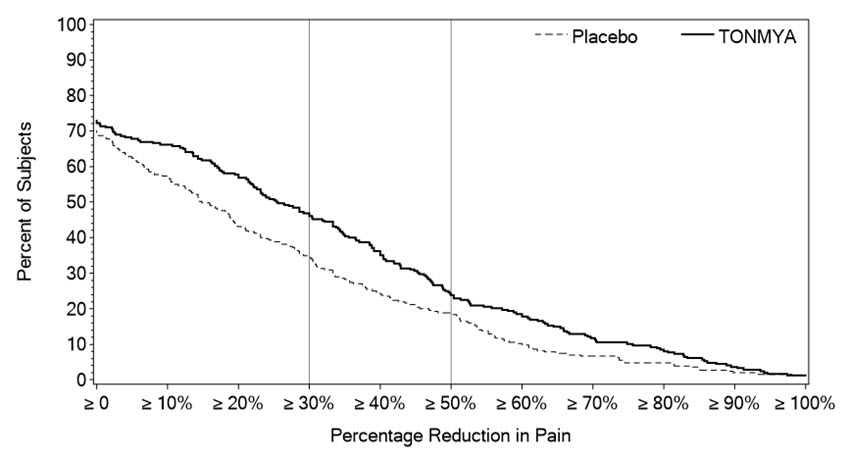 This text provides information about the percentage reduction in pain for subjects comparing Placebo vs. TONMYA. It includes percentages ranging from 20% to 100%, highlighting the different levels of pain reduction observed.*