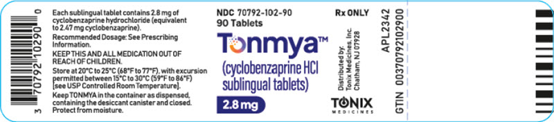 The following 6 images provide visual information about the product associated with Tonmya NDC 70792-102 by Tonix Medicines, Inc., such as packaging, labeling, and the appearance of the drug itself. This resource could be helpful for medical professionals, pharmacists, and patients seeking to verify medication information and ensure they have the correct product.