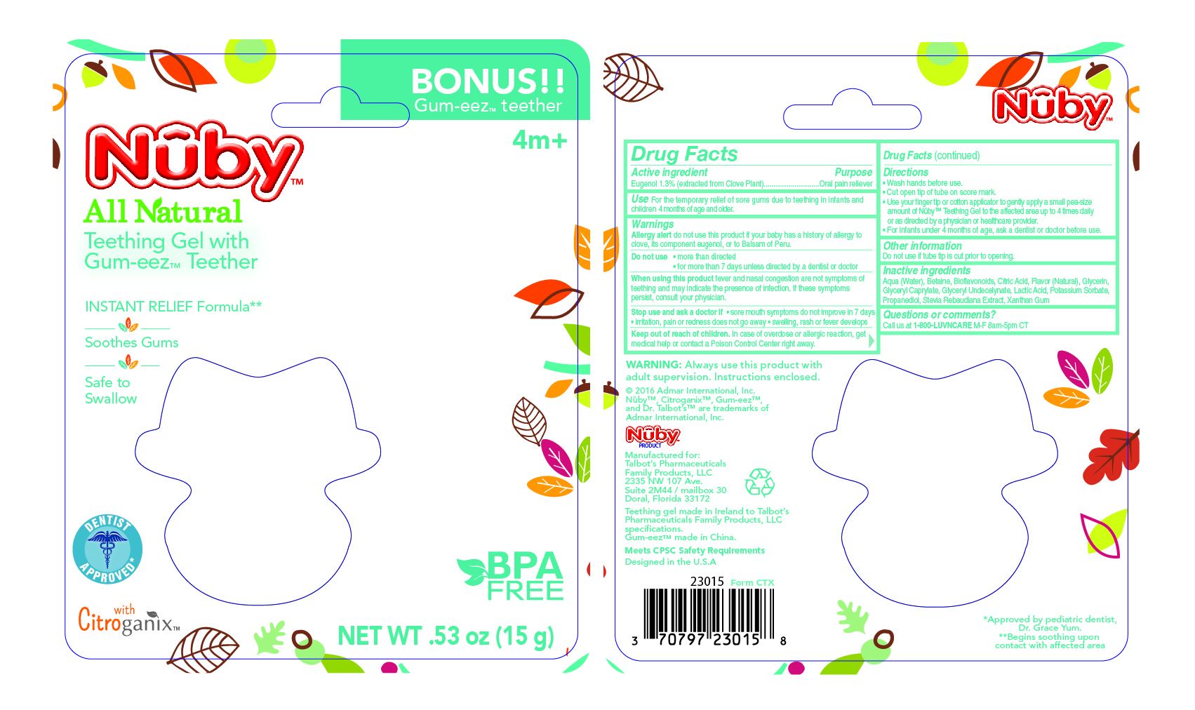 The following 3 images provide visual information about the product associated with Nuby Teething Gel NDC 70797-230 by Talbot�s Pharmaceuticals Family Products, Llc., such as packaging, labeling, and the appearance of the drug itself. This resource could be helpful for medical professionals, pharmacists, and patients seeking to verify medication information and ensure they have the correct product.